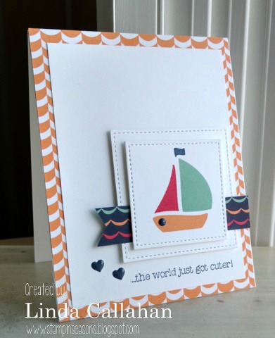 This is one sweet card! Love the layered stitched squares and the DSP you chose to go with the sailboat. Another perfect baby card!!